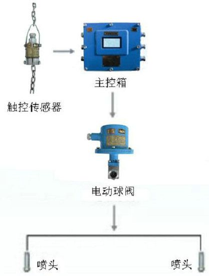 當皮帶運輸機輸煤時,煤流觸動傳感器探桿,觸控傳感器接收到信號觸發(fā)主控箱控制電路,打開電動球閥,裝置自動灑水降塵,無物料時延時一段時間后停止噴霧(延時可調)。