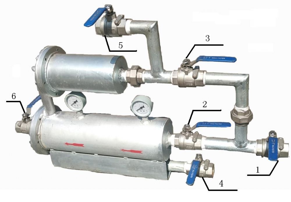 序號(hào)1、2是進(jìn)水閥門(mén),序號(hào)3是反沖洗閥門(mén),序號(hào)4是主過(guò)濾器排污閥門(mén),序號(hào)5是副過(guò)濾器排污閥門(mén),序號(hào)6是出水口閥門(mén)